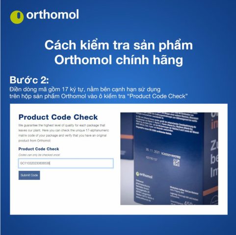Bước 2:  Điền dòng mã gồm 17 ký tự, nằm bên cạnh hạn sử dụng trên hộp sản phẩm Orthomol vào ô kiểm tra “Product Code Check”