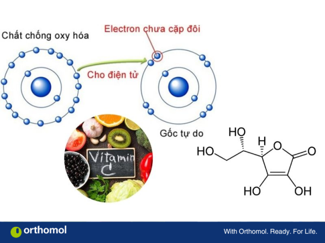 Vitamin C là một chất chống oxy hóa mạnh mẽ, có tác dùng chống lại các gốc tự do trong cơ thế bằng cách trùng hòa phân tử gốc tự do có hại và chuyển chúng thành các chất vô hại mà cơ thể có thể đào thải ra ngoài, giúp bảo vệ tế bào khỏi tổn thương do các gốc tự do gây ra và làm chậm quá trình lão hóa.